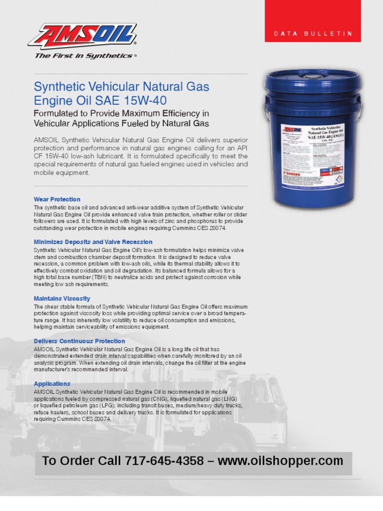 AMSOIL Synthetic Stationary Natural Gas Engine Oil is formulated with low sulfated ash to minimize carbon deposits and port blockage, resulting in reduced maintenance and extended equipment life. Advanced anti-wear and anti-scuff protection helps control valve ... Doc Retrieval